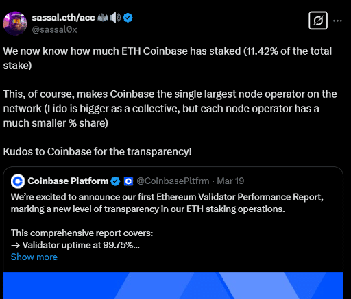 Coinbase目前已成为以太坊网络最大的运营商,这一情况引发了部分人士的担忧。3月19日,该公司披露其控制了超过11%的质押ETH,超过了其他任何以太坊节点运营商。这种集中化的权力让一些专家认为可能对网络不利。
