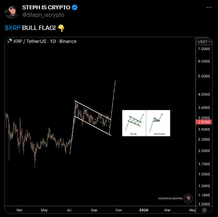 市场分析师Steph在XRP日线图上识别出看涨旗形形态,该技术结构通常在强势上涨后出现,被视为趋势延续信号。这一形态形成于可控回调阶段,使交易者得以消化前期涨幅后重启升势。随着更低的高点与更高的低点逐渐收敛,该结构显示市场处于健康盘整而非动能衰竭状态。
