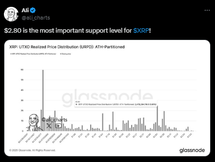 分析师Ali引用链上数据显示,2.8美元附近存在显著持仓密集区,形成关键支撑。通过UTXO实现价格分布(URPD)指标可发现,大量投资者在该价位区间建仓。该支撑带有效吸收抛压,维持近期价格稳定。只要XRP维持在该水平上方,长期持有者惜售情绪将增强市场韧性。