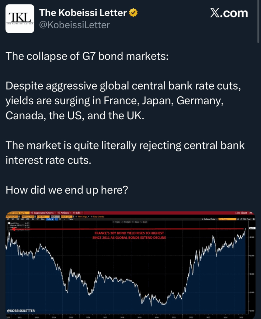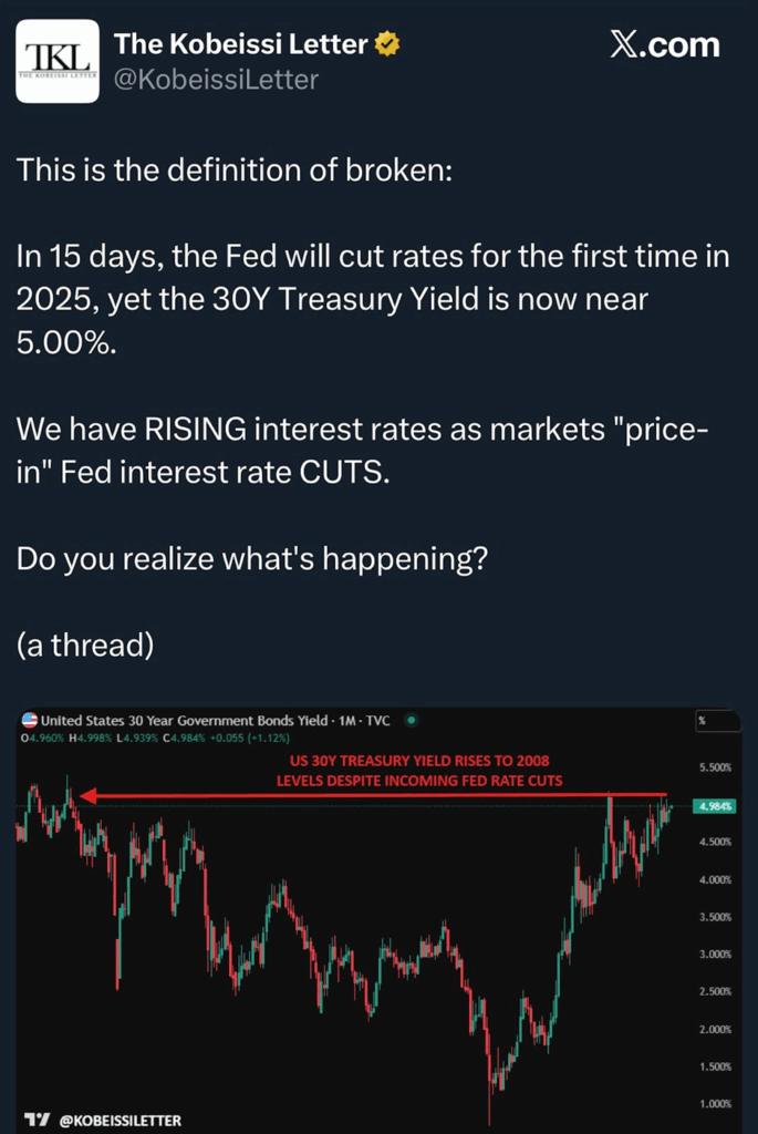 近期加密市场热议美联储九月可能降息,交易员们本应为此兴奋。通常政策利率下降会刺激风险资产上涨,但这次情况更为复杂。政府债券收益率持续攀升,其他地区未必同步宽松,黄金正吸引避险资金——这些因素叠加可能持续压制加密货币市场。