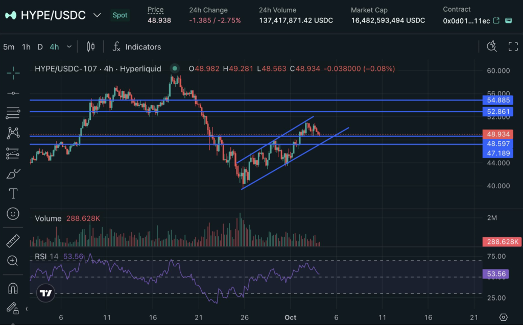 4小时图上HYPE形成看跌旗形形态,预示短期或将盘整。48.59-47.18美元构成支撑区间,若买盘动能恢复,52.9美元附近阻力位或将确认突破。