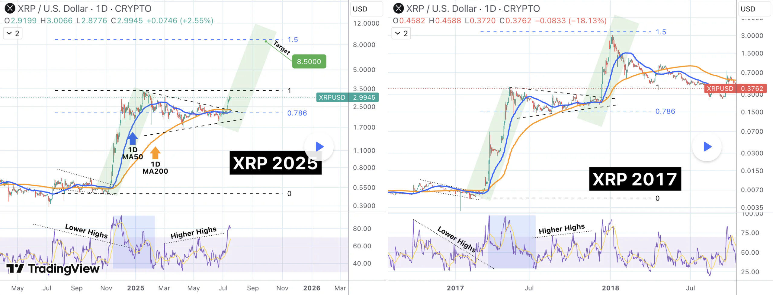 值得关注的是整体技术形态:当前震荡整理阶段与XRP历史周期高度相似,50日均线即将上穿200日均线形成黄金交叉,且上涨轨迹与1.5斐波那契扩展位重合——这些信号暗示年底前可能攀升至8.5美元。