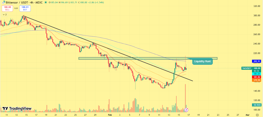 随着上市消息确认,TAO价格反应剧烈。买家迅速涌入这一新的韩国市场准入叙事,推动价格在几分钟内快速冲高至200-210美元区间。这一走势初看颇具冲击力,但后续动能未能持续。涨势在扫清200美元上方整数关口流动性后便戛然而止,该区域此前曾多次成为止损订单的聚集点。
