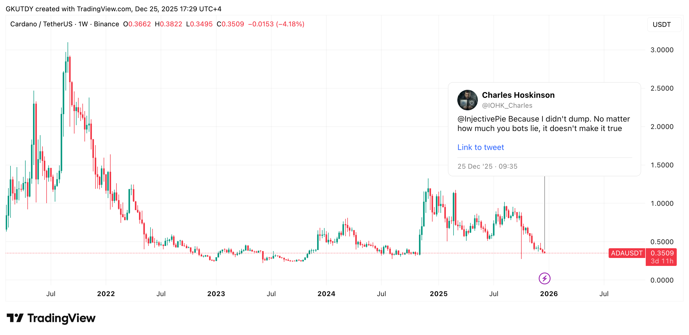 查尔斯·霍斯金森再次出现在回复区,而这次的话题与技术无关——而是针对那个老生常谈的指控:他在高点抛售了ADA。此前他在圣诞帖文中提到“这是漫长而艰难的一年”,并称2026年值得期待。随后有评论者指责他在2021年以3美元价格抛售ADA,却拒绝在目前0.3美元左右的价格回购。