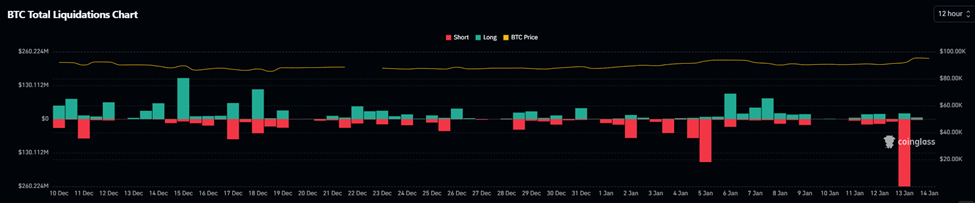 清算数据显示,相当多的衍生品交易者预期会出现反转。因此,比特币价格推升至95,000美元上方。周二,价值约2.7亿美元的空头头寸被清算。