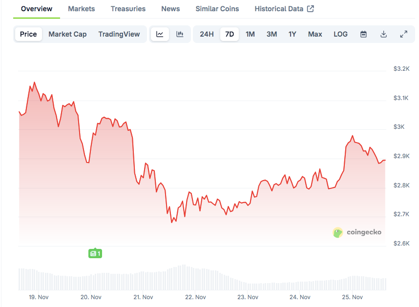 CoinGecko数据显示当前价格为2895.53美元,过去一周累计下跌5.31%的总体趋势仍待观察。上行路径指向3060美元附近的阻力集群,该区域延伸至3230美元,将成为多空方向确认的关键区域。若成功上攻3230美元,将推动ETH重回数周震荡后的重要转折点。