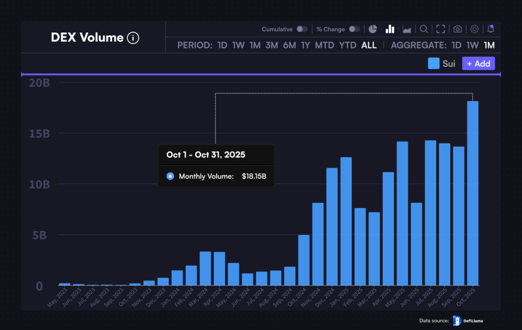 根据DeFiLlama数据,Sui在2025年10月创下181.5亿美元月DEX交易量新纪录,这是该网络首次单月突破180亿美元大关。ToreroRomero在X平台分享更新称:"$SUI首次实现180亿美元月DEX交易量"。