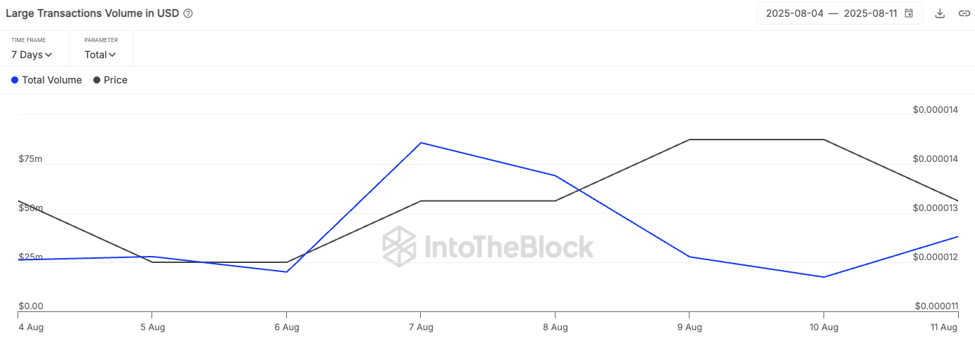 柴犬币(SHIB)近期经历了数周来最剧烈的大额交易活动,短短两日内大额交易量激增218%。据IntoTheBlock数据显示,其大额交易额从8月10日的1743万美元飙升至8月11日的3809万美元。