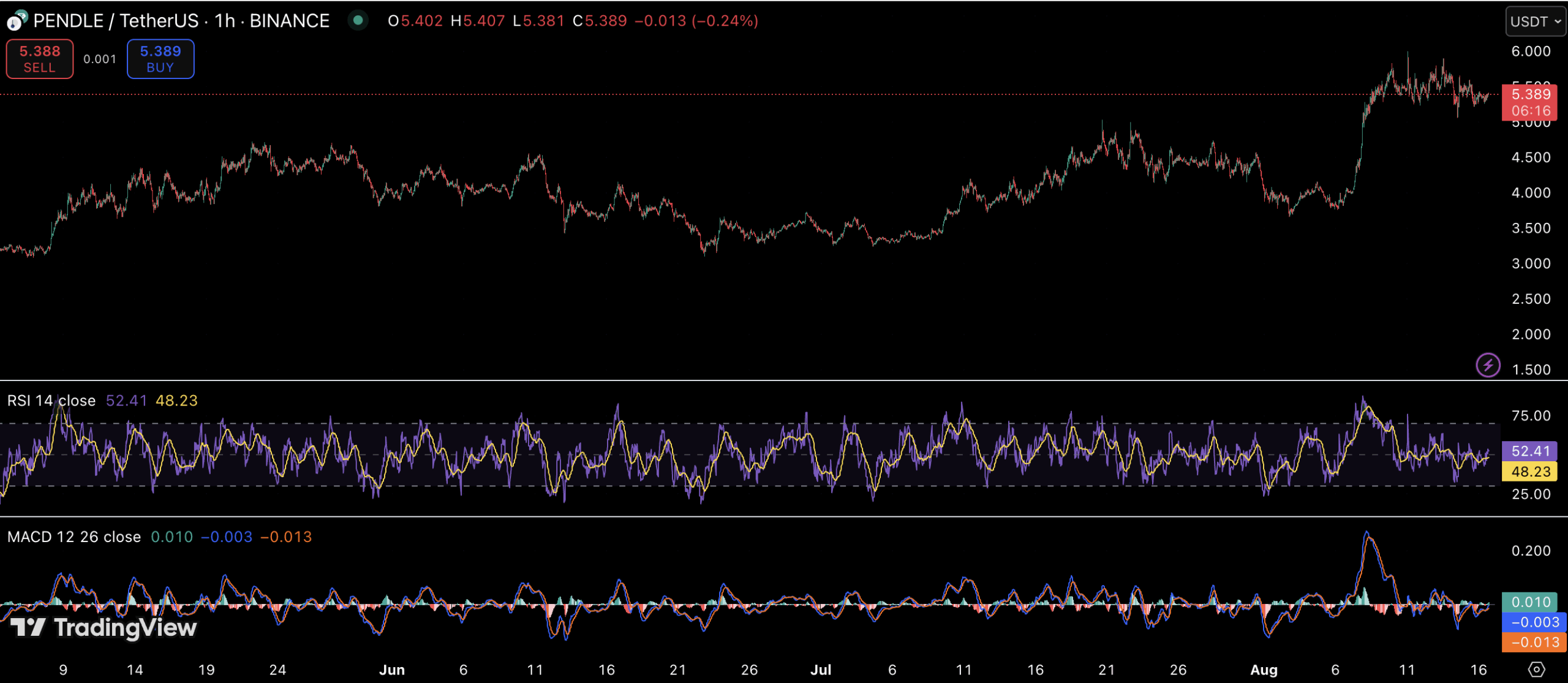 截至发稿,PENDLE交易价格约5.39美元,维持在30日简单移动平均线(4.64美元)和200日指数移动平均线(3.99美元)上方。MACD柱状图近期转正(+0.077),显示初步看涨动能,但RSI-14处于中性的59.95水平,表明买卖压力均衡。