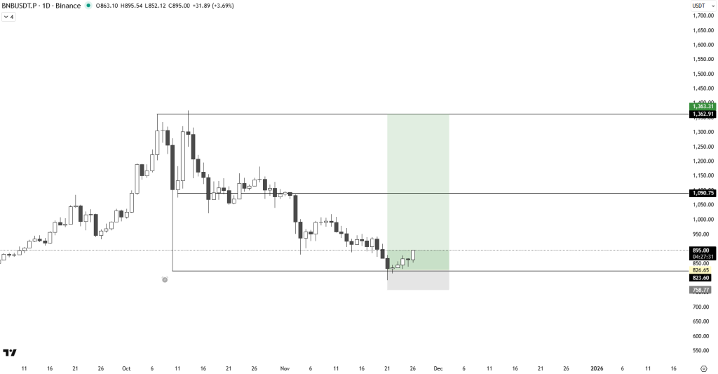 短期图表同样呈现向好态势。在连续数周创出更低低点后,BNB终于形成更高的低点结构,并伴随更强劲的上行动能。多头在底部快速进场,日线图上留下明确的反转信号。成交量同步温和放大,通常表明这并非弱势反弹。