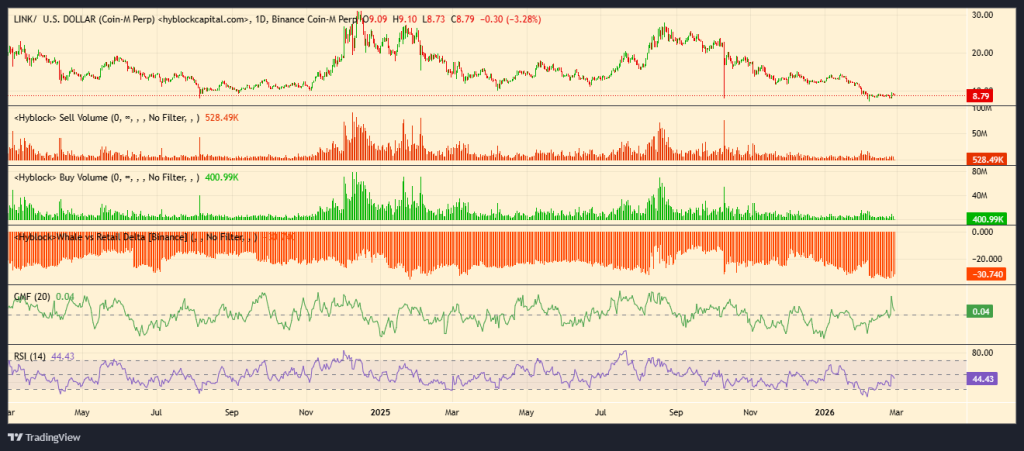 观察Chainlink价格图表可见更多细节:RSI指标现位于44.38,正从超卖区间回升。既未达狂热水平,也未显现过热迹象,仅处于修复阶段,表明下行动量正在消退。