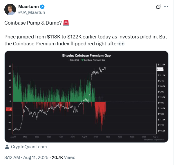周一比特币价格急速攀升至122,319美元后显现疲态。本轮上涨由机构投资者和企业资金管理部门的强劲需求推动,使价格接近7月中旬123,091美元的高点。然而价格冲高后,Coinbase溢价指数迅速转负。该指数反映Coinbase Pro美元市场与币安USDT市场的价差,负值通常意味着Coinbase平台抛压更大。