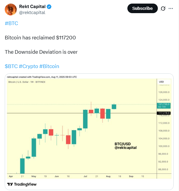分析师Rekt Capital观察到比特币日内重新站上117,200美元——该位置此前曾是阻力位。下一关键阻力位于123,000美元,突破后或将挑战125,000美元目标位。