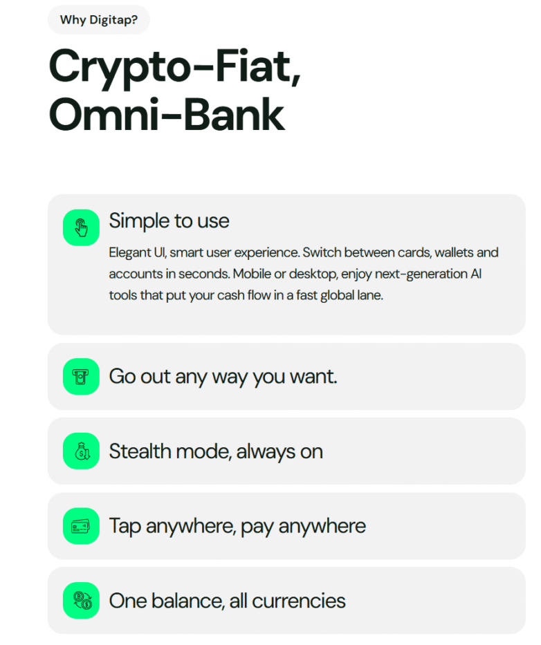 当稳定币正推动传统金融机构进入加密领域时,Digitap($TAP)已创建了两者在同一平台上无缝共存的解决方案。其全能银行为用户提供持有、交易、管理加密货币与法币的一站式平台。