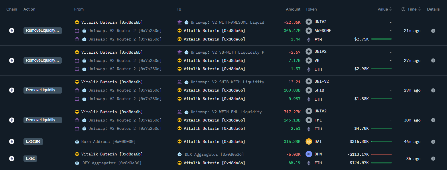 以太坊联合创始人Vitalik Buterin近期抛售了大量模因币,包括一些不知名和假冒的代币。根据OnChain Lens的数据显示,Buterin通过出售这些模因币获得了315,382 DAI,并将其兑换为71.69个ETH,价值约136,684美元。