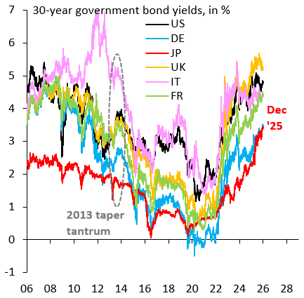 经济学家罗宾·布鲁克斯清晰剖析了这一矛盾现象:关键点在于,日本长期利率虽已显著上升,但仍远低于市场自由定价可能达到的水平。当前日本央行仍是国债总量的主要购买者,这意味着长期收益率实际上受到压制。
