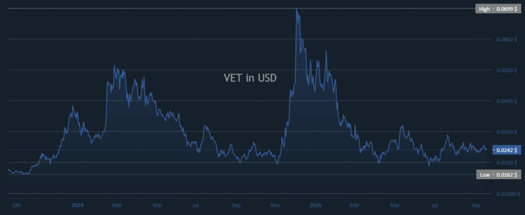 唯链(VET)当前正在测试0.03美元的关键阻力位,若成功突破将确认看涨趋势延续。该代币在触及0.0699美元年度高点后经历了大幅回调,最终稳定在0.020-0.030美元的盘整区间内。