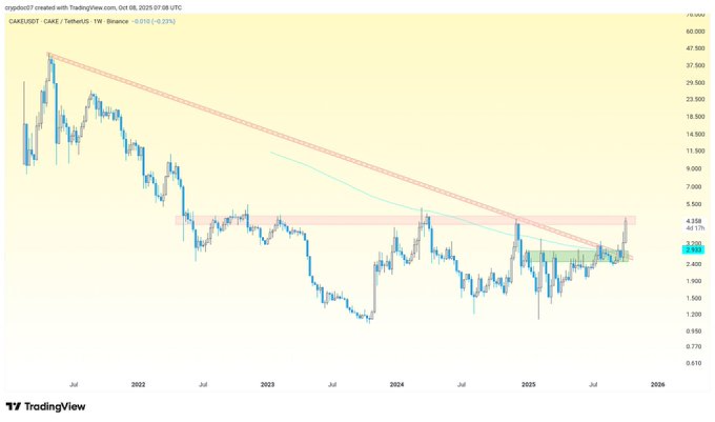 从图表来看,PancakeSwap价格刚刚突破长达567日的对称三角形形态,日内甚至触及4.55美元高位。动能指标全线飘绿,显示买盘强劲。交易员正密切关注4.95美元关键阻力位——若突破该2012年以来未破的价格关口,或将打开通往9美元目标的上升通道。