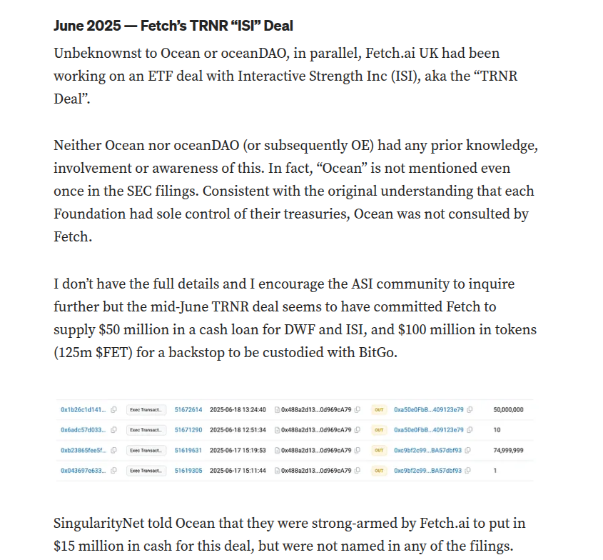 2025年6月的TRNR交易成为导火索——Fetch擅自将包括Ocean资金库在内的大额资产质押给未知贷款,最终因10月市场波动导致$FET抵押品被清算。整个过程中Ocean既不知情也未签字同意。