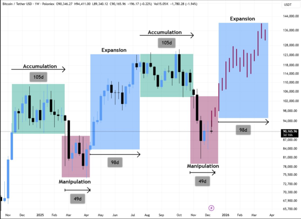 长期图表显示比特币正在重复“三重力量”周期。该模式经历三个阶段:吸筹、操纵和扩展。每个吸筹阶段持续约105天,操纵阶段持续49天,随后进入98天的扩展期。近期走势显示又一个49天操纵阶段结束,新一轮扩展行情即将启动。