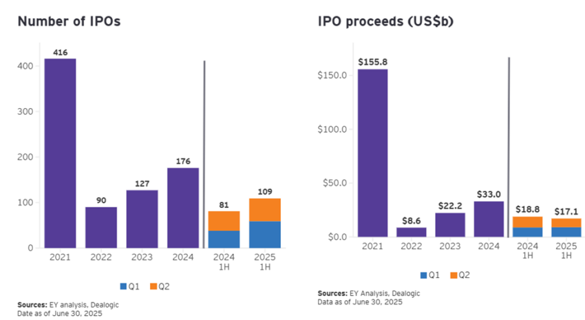 形成鲜明对比的是,美国交易所2025年上半年完成156宗IPO,融资总额约283亿美元,彻底碾压伦敦数据。EY Americas报告显示,尽管总收益有所下降,2025年第二季度美国IPO数量仍较2024年同期增长16%。