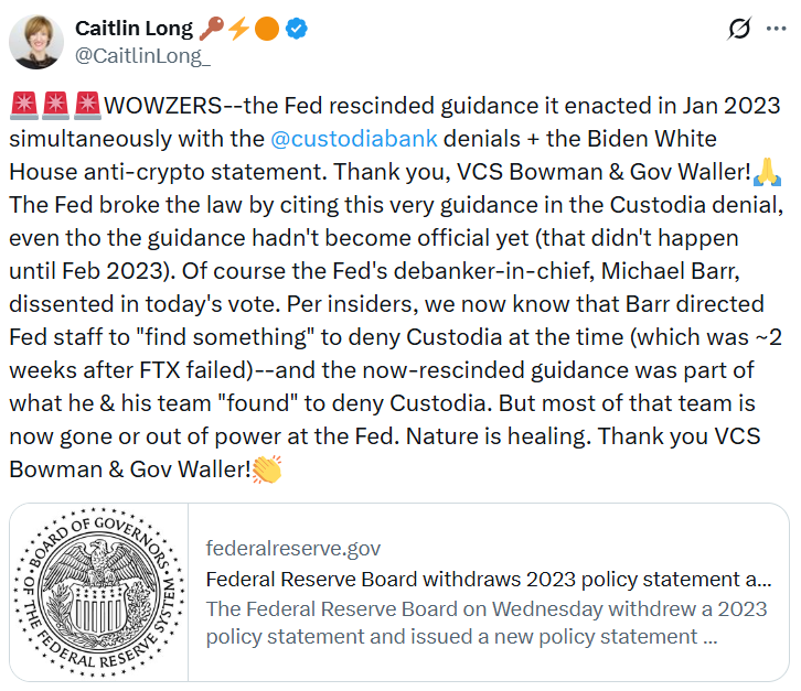 美联储解释撤销指引的关键原因在于其已过时,且"金融体系及理事会对创新产品服务的认知均已实现演进"。声明强调:"2023年政策声明已不再适用,故予以撤销。"专注加密领域的Custodia银行首席执行官Caitlin Long周三在X平台发声支持这一决定,指出正是该指引导致其机构此前申请主账户遭拒。