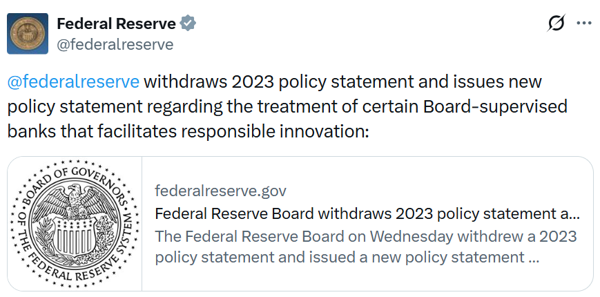 随着美国监管机构持续转向积极拥抱数字资产,美联储已正式撤销了2023年发布的监管指引。该指引原先要求包括未投保银行在内的所有美联储监管银行在开展加密业务时遵循与联邦投保机构相同的规则,其核心理念是相似业务应承担相似风险并接受同等监管。这项政策曾导致未投保银行无法开展国家银行禁止的业务(如加密服务),并因此丧失美联储会员资格。