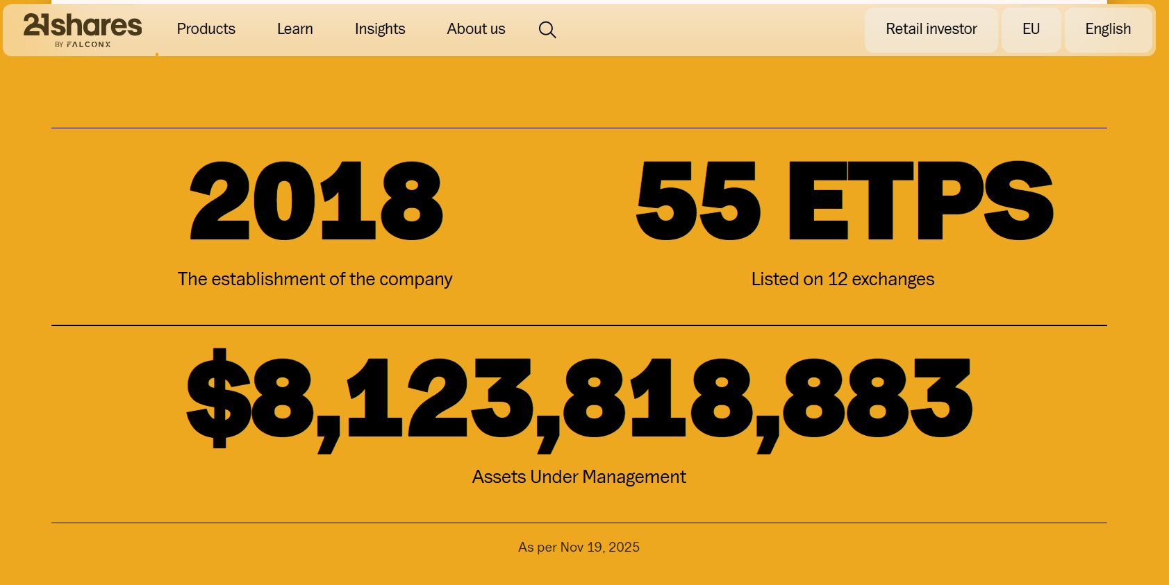 目前21Shares共提供55种不同产品,在12家交易所运营,其管理资产规模已突破80亿美元。