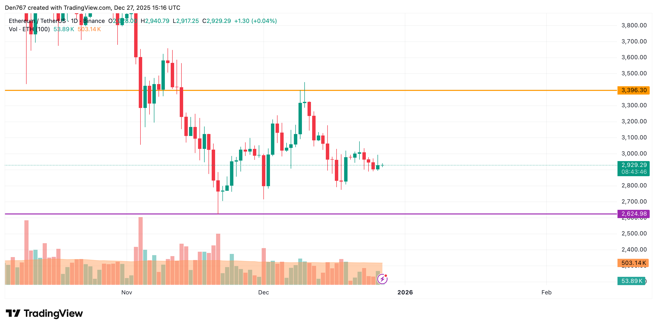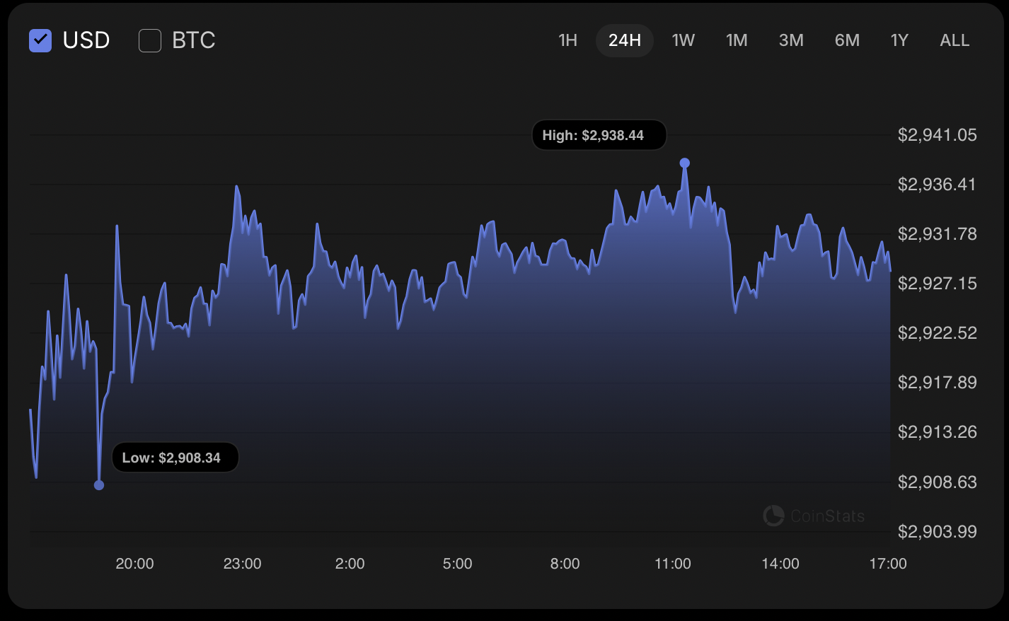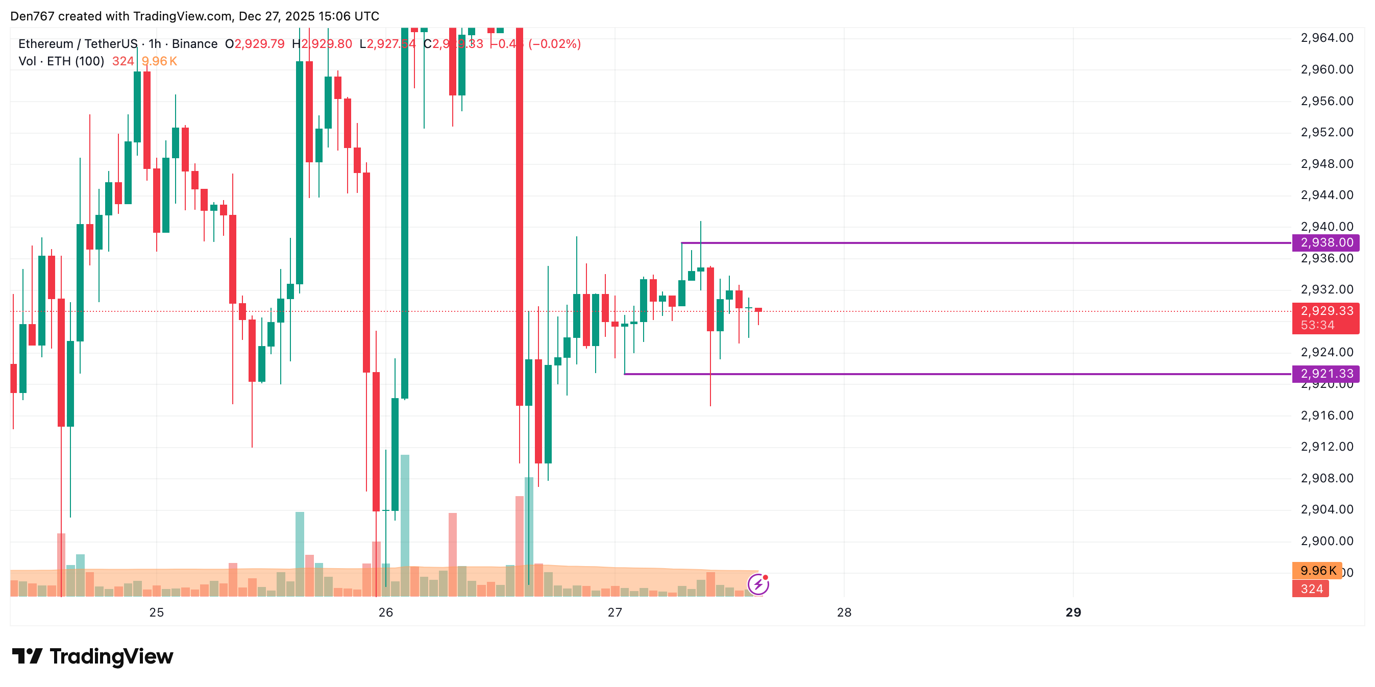 ETH价格目前处于2921美元支撑位与2938美元阻力位构成的局部通道中轨。由于多空双方均未占据主导,预计明日出现剧烈波动的可能性较低。