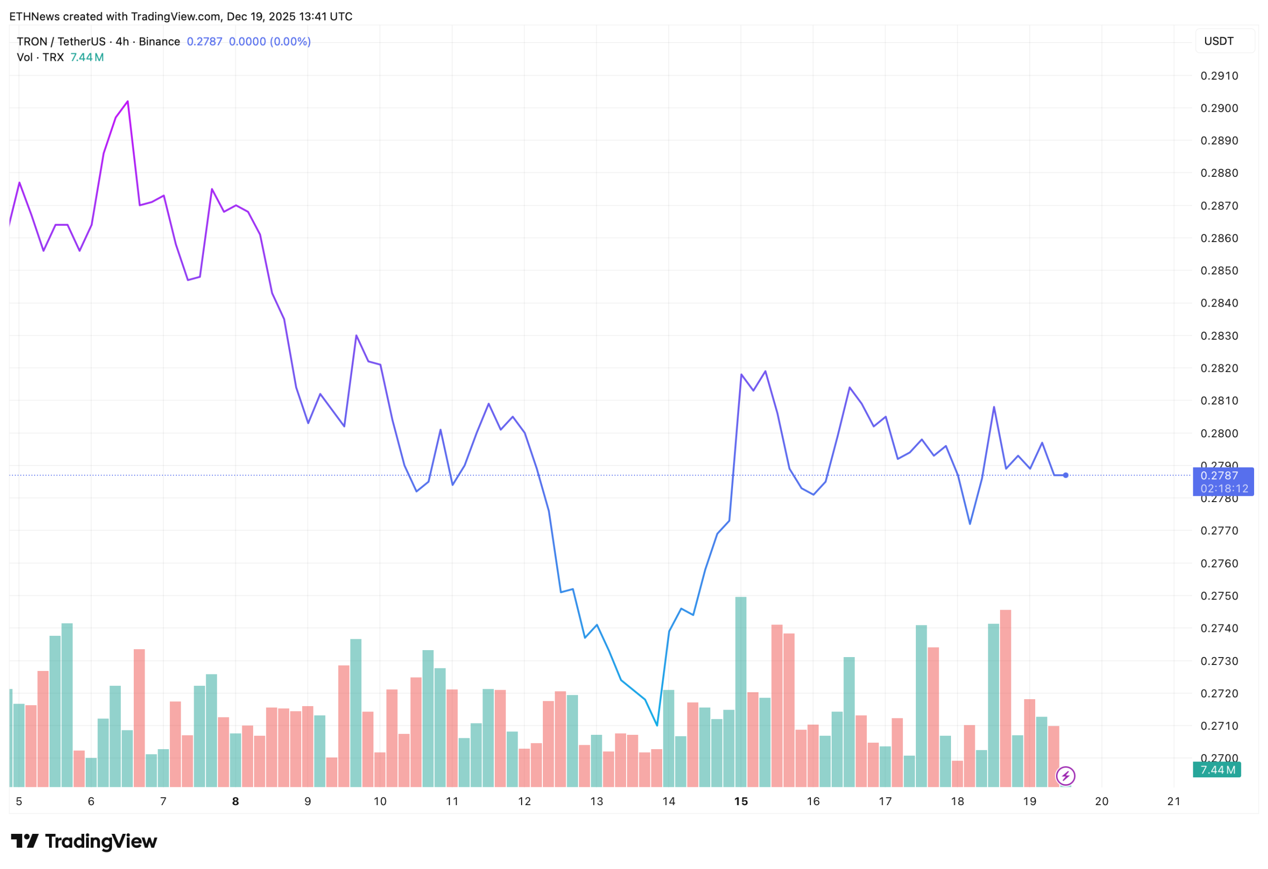 4小时图表与此观点吻合。TRX从0.29美元区域下跌后,在0.27美元附近获得短暂支撑并小幅反弹。但此次反弹迅速停滞,转为在0.278美元区域横向震荡。