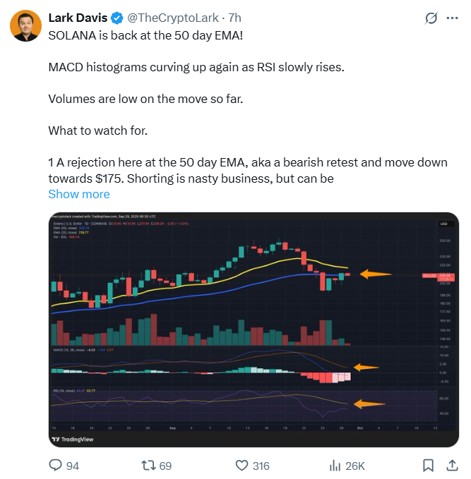 市场分析师Lark Davis指出Solana价格正处在重要技术位附近。他在报告中披露,SOL当前交易价格接近209美元的50日指数移动平均线(EMA)。Davis认为存在两种可能路径:若价格在50日EMA处受阻,可能回调至175美元;若能站稳210美元上方,并在220美元(20日EMA附近)确认支撑,则有望开启新一轮上涨。