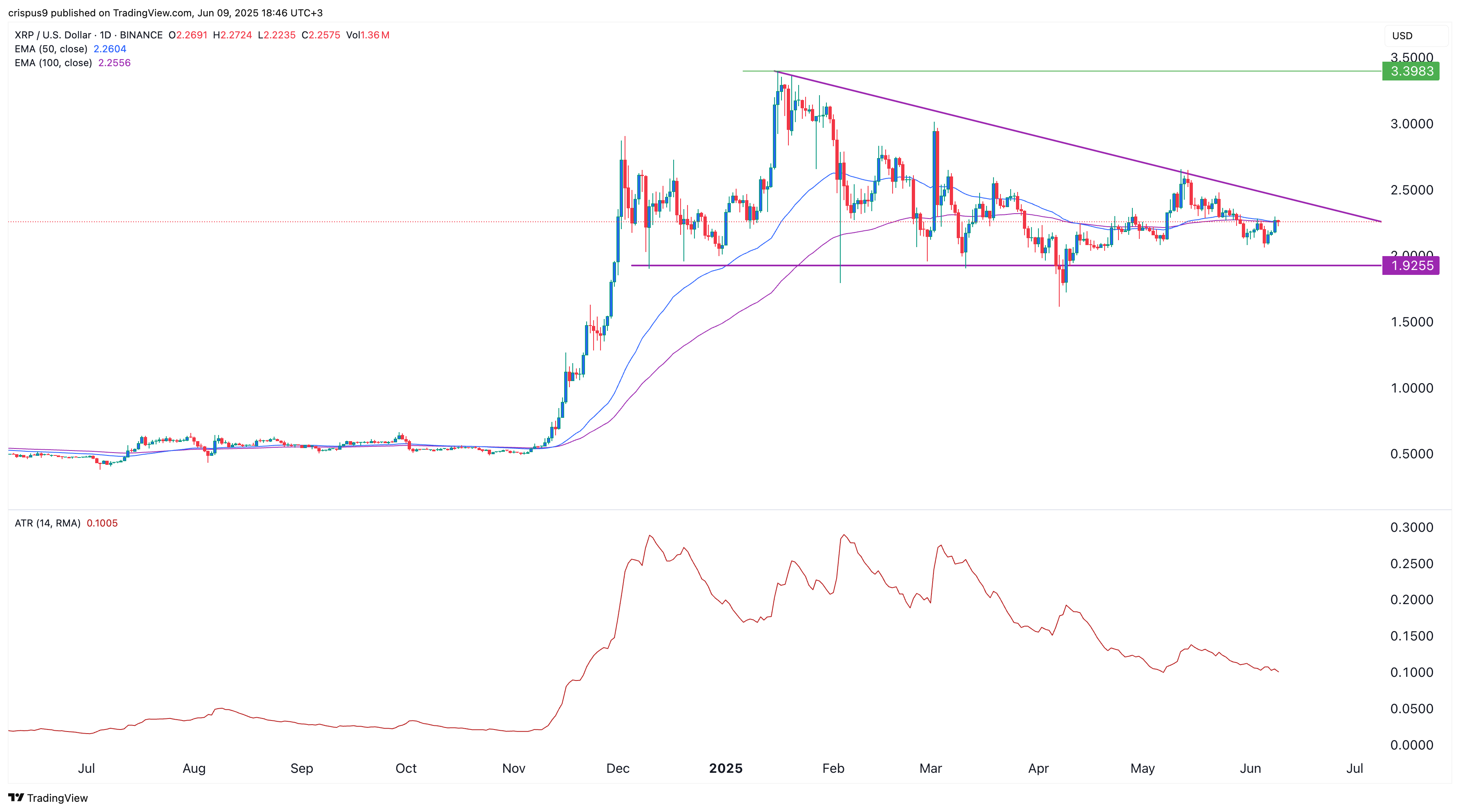 日线图显示,XRP已从年内高点3.40美元回落至2.2592美元。当前价格在50日和100日均线附近震荡,平均真实波幅(ATR)跌至11月29日以来最低水平,表明波动性正在减弱。