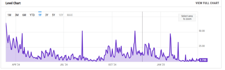 升级前,Gas费用一度失控。2024年期间,以太坊平均Gas价格约为72 gwei。根据YCharts提供的数据,截至2025年3月12日,该价格已暴跌至仅2.7 gwei。这使得常规交易成本大幅降低。