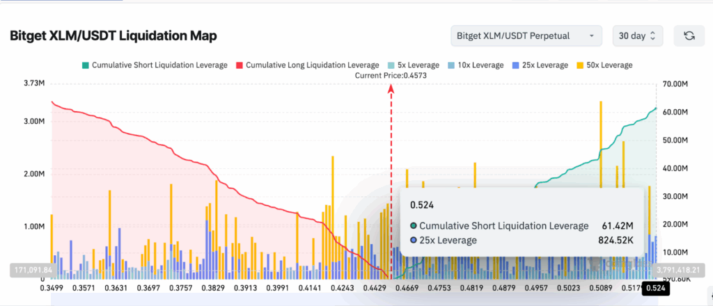 最新清算地图显示,虽部分空头仓位已被平仓,但仅Bitget平台仍有价值超5200万美元的XLM空单未平仓,这将成为后续上涨的潜在燃料。