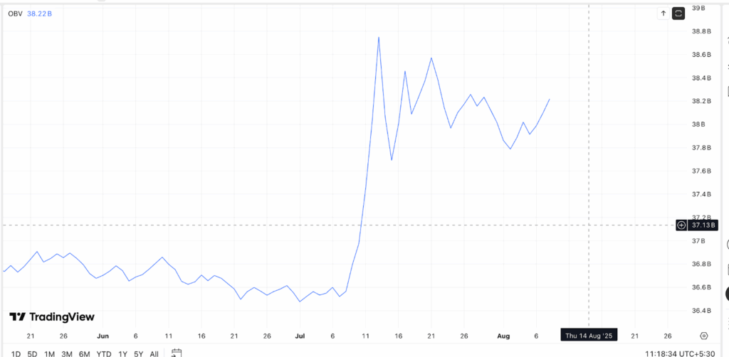 能量潮指标(OBV)随价格同步攀升,形成高点不断抬高态势,这对XLM价格构成看涨信号。OBV通过累加上涨日成交量、扣除下跌日成交量来追踪资金流向,其与价格的同步上升表明需求正在增长。