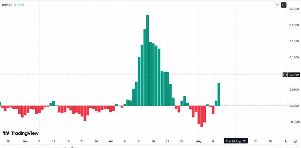 牛熊力量指数(BBP)同样呈现积极信号。该指标通过测量买方最高出价与卖方最低要价差值来研判市场主导力量,突破期间BBP转绿显示买方力量占据上风。