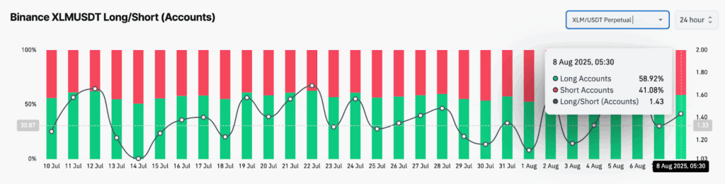 Binance多空比显示,当前近60%交易账户持有XLM多头仓位,表明零售端看涨情绪正在积聚。虽未达极端水平,但已足够支撑价格走强,特别是若机构资金同步入场。