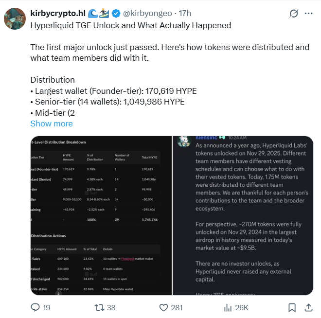 在项目团队解锁1,745,746枚HYPE后,Hyperliquid交易量近期下跌32%。值得注意的是,此次解锁恰逢代币生成事件周年纪念日,使社群注意力转向交易活动。这些钱包动向以及新增供应可能如何影响市场行为,已成为更广泛市场的讨论焦点。