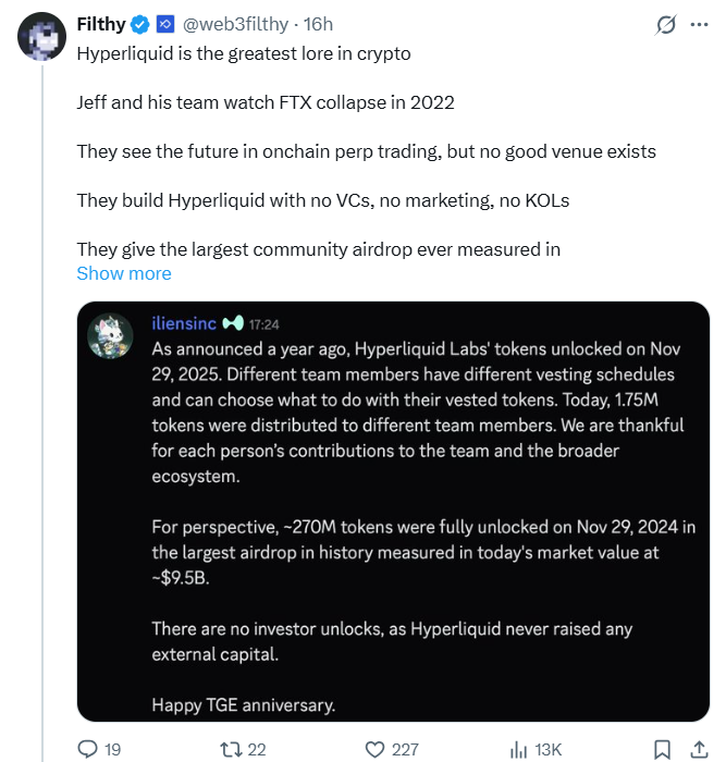 解锁讨论激发出对Hyperliquid整体发展故事的新一轮关注。包括Filthy在内的社群成员重新回顾了项目在2022年FTX崩盘后的起步历程:团队在没有风投支持、未进行大规模推广、仅由少数工程师组成的情况下构建了该交易所。