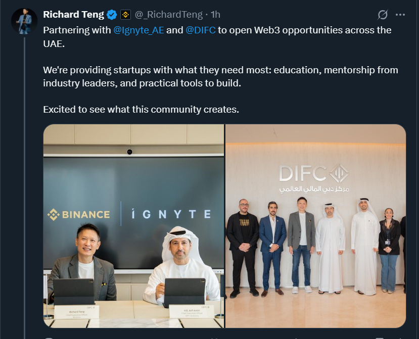 全球最大加密货币交易所币安于10月1日官方声明中透露,其成为首家与迪拜国际金融中心(DIFC)旗下Ignite生态合作的企业,该合作隶属于阿联酋数字经济战略。CEO郑长嵘通过X平台向加密社区阐述此次Web3布局,强调"Web3并非取代Web2,而是让用户重获数据主权、身份掌控及经济参与权"。