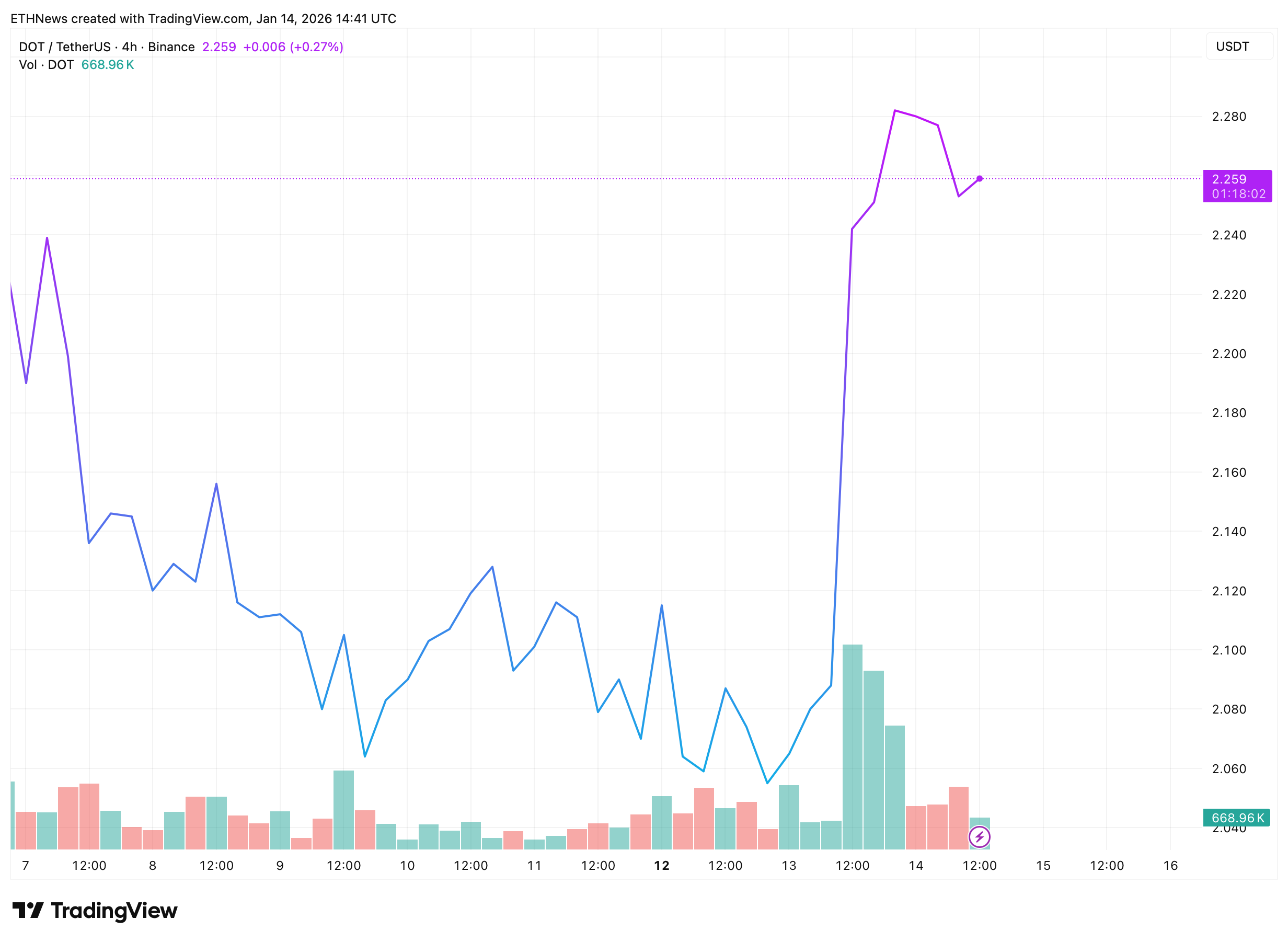 价格从2.06美元区域急速拉升,该位置曾是DOT数日窄幅波动的区间。此基础支撑推动价格快速突破2.24美元,并短暂触及2.28美元区域,随后动能减弱。DOT并未出现反转,而是进入紧密整固状态,稳守于此前难以突破的关键价位之上。