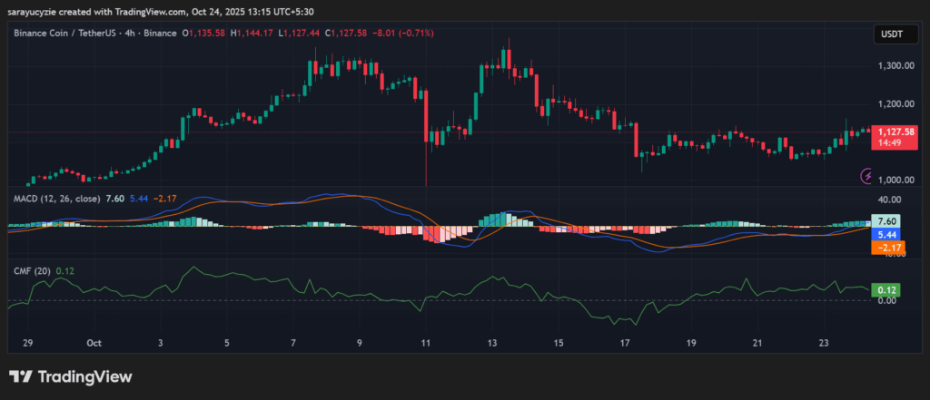 从指标来看,BNB的MACD线位于零轴上方且信号线在其下方,暗示上行趋势处于早期阶段。Chaikin资金流量指标(CMF)报0.12,表明市场存在温和买压——正值状态显示资金呈现净流入态势。日线相对强弱指数(RSI)54.80显示中性偏多信号,后续走势将取决于市场条件变化。而24.92的牛熊力量指标(BBP)则确认了当前市场多头的主导地位,这种积极态势可能延续上涨动能。