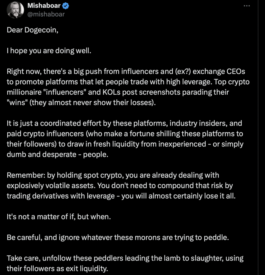 狗狗币社区最具代表性的意见领袖之一Mishaboar发出强烈警告,提醒交易者警惕当前某些意见领袖鼓吹的高杠杆交易趋势。他在社交平台X上发文表示:"这几乎注定会血本无归,只是时间问题。"杠杆交易虽然能放大收益,但也会加剧亏损。Mishaboar建议狗狗币持有者坚持现货持仓,而非通过杠杆衍生品追逐短期利润。