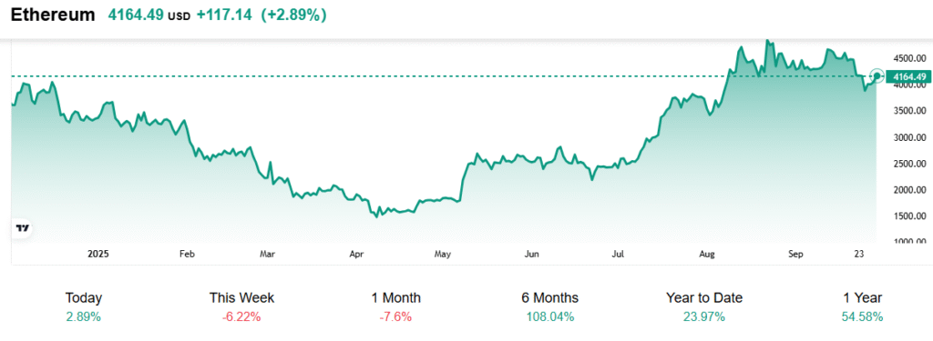以太坊现报4,164.49美元,日内涨幅2.89%,显示近期回调后的韧性。尽管短期出现下跌,但更长期趋势仍保持上行。价格走势表明市场在前期压力后正重拾信心。