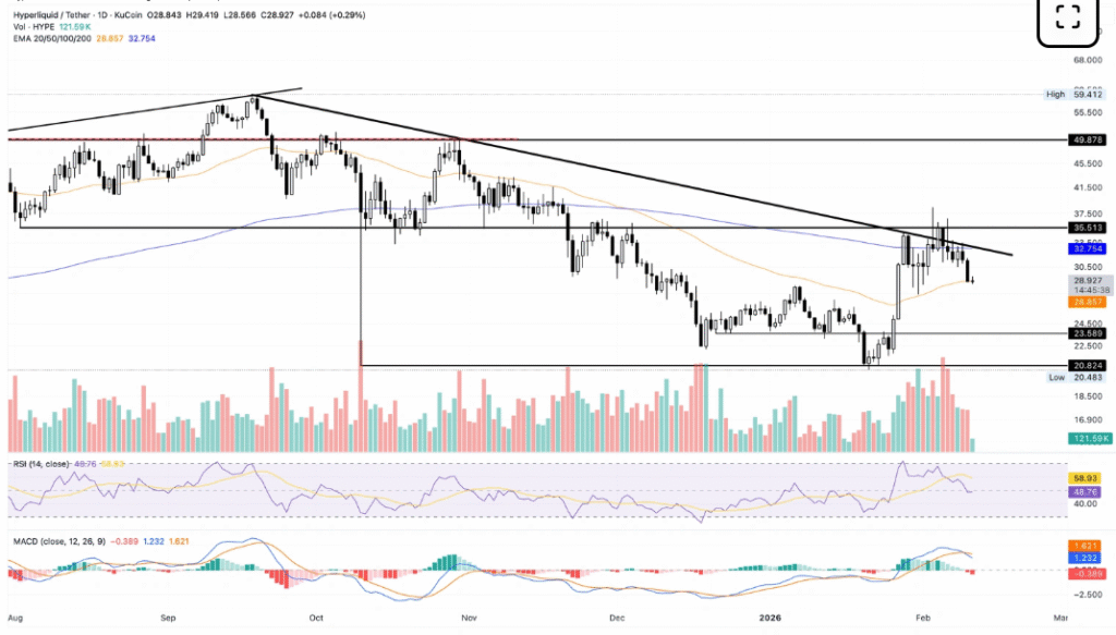 HYPE价格持续在50日指数移动均线下方挣扎,预示着市场前景正在走弱。