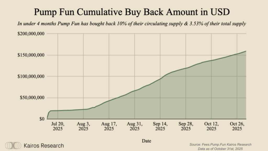 分析平台Kairos Research数据显示,Pump.fun在不到四个月内已回购10%的流通量,相当于从市场永久移除352.8亿枚PUMP,协议为此支出约1.6亿美元。按总供应量计算,已完成3.53%的代币销毁。