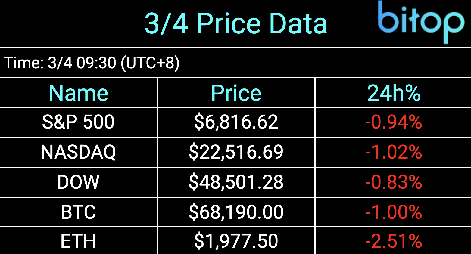 昨日比特币(BTC)一度下跌超4.5%至66,171美元后收窄跌幅;以太坊(ETH)盘中跌6%,撰稿时交易价格略低于2,000美元。