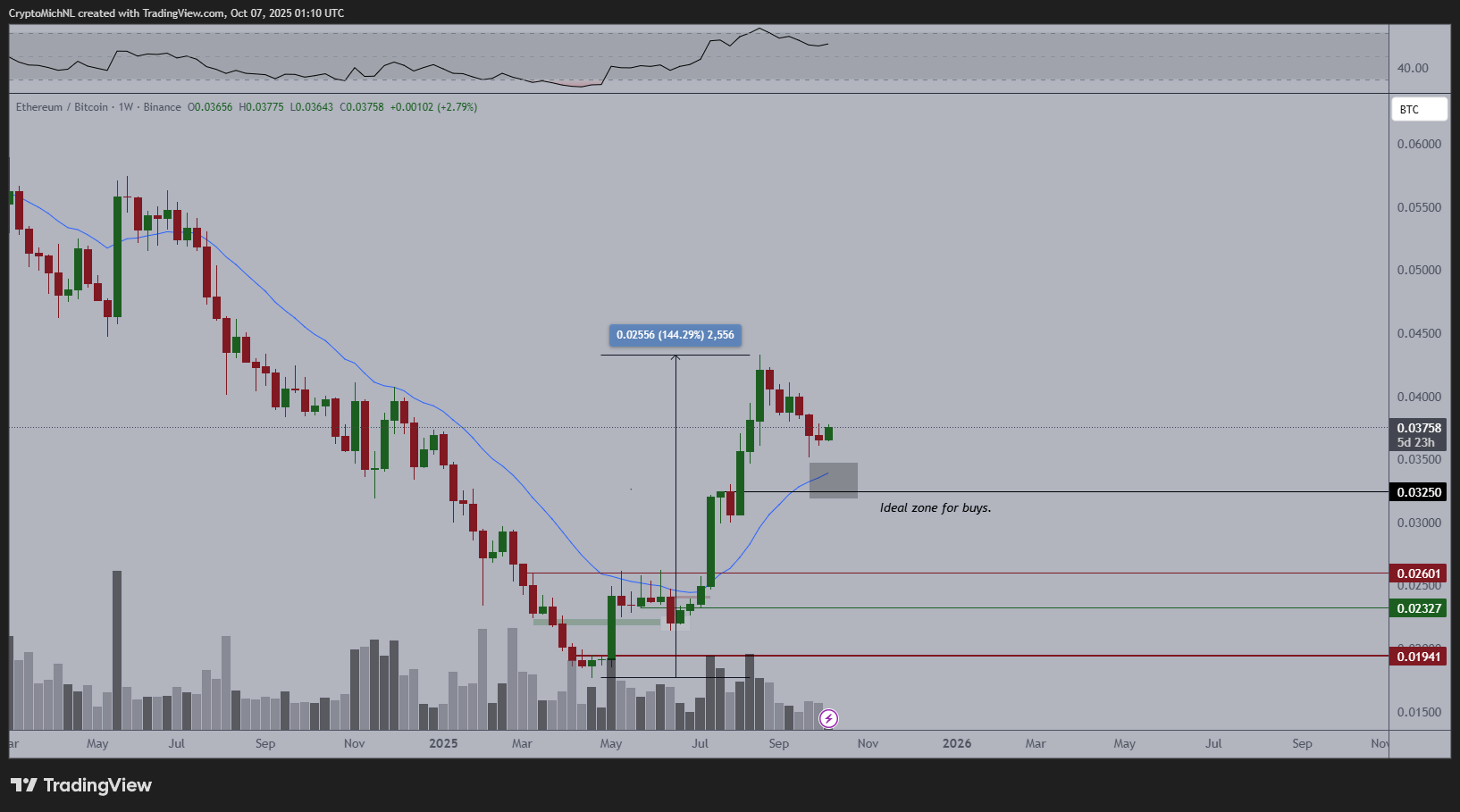 在ETH/BTC交易对中,以太坊正试图在持续数月的下跌趋势后收复失地。当前的盘整区域与历史积累区重合,表明交易者可能正在为新一轮上涨做准备。分析师认为,若周线收于0.037 BTC上方,将确认新上升趋势的开始。
