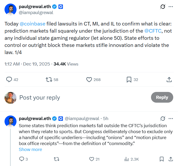Coinbase首席法务官保罗·格鲁沃尔在周五的X平台发文中表示,提起诉讼是为"确认一个明确事实:预测市场完全属于@CFTC管辖范围,不应受任何州级博彩监管机构管辖(更不用说五十个州)。"