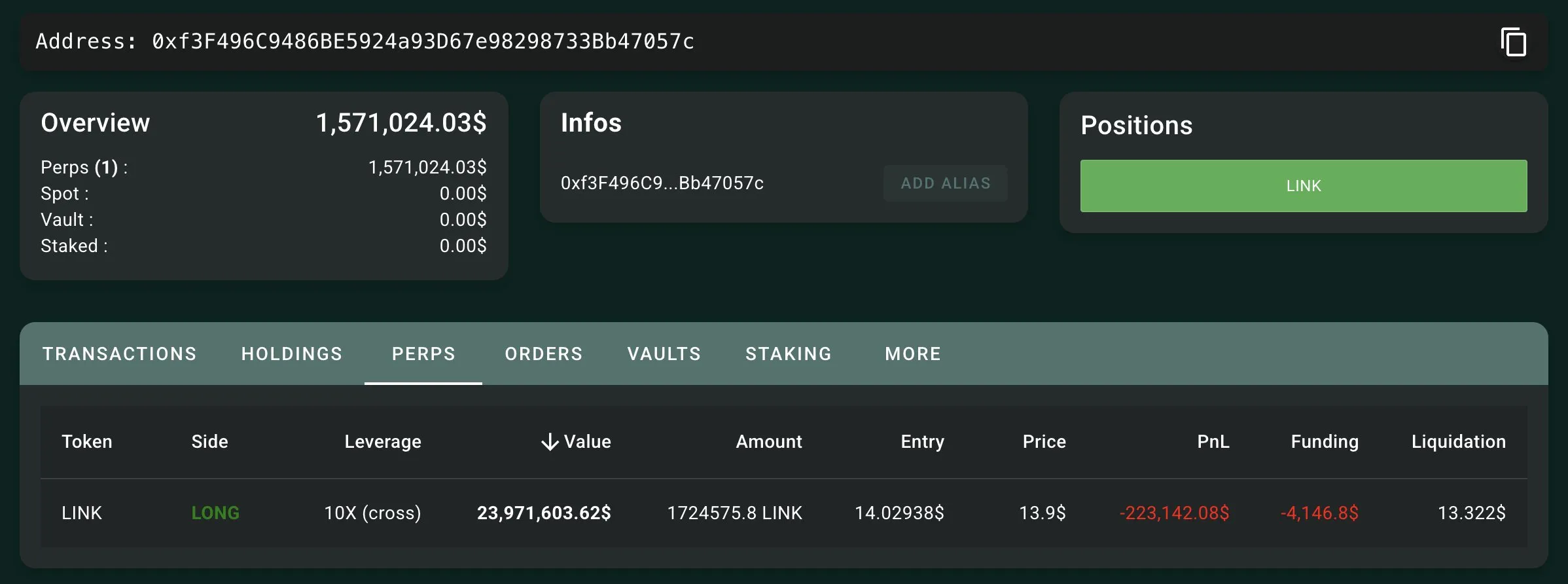 尽管进行了这些交易,Chainlink仍持有3.425亿枚LINK,价值47亿美元,分散在多个钱包中。链上情报公司Lookonchain发现,一位知名“鲸鱼”已将其注意力转向了LINK。这位被称为“ETH 50倍大亨”的交易员近期在Hyperliquid平台上进行了一笔重大交易,最终导致其损失了400万美元。